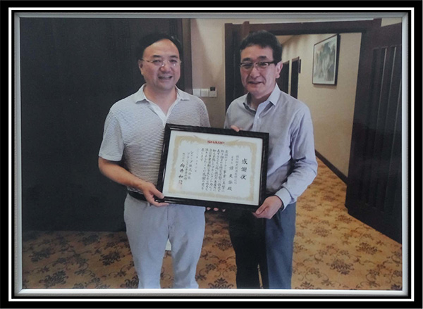 2013年9月 向井和司さん(右:シャープエナジー事業(yè)部本部長(zhǎng))がソーラーギガに感謝の意を示すため、譚文華さん(左:錦州ソーラーギガ會(huì)長(zhǎng))に感謝狀を送りました。