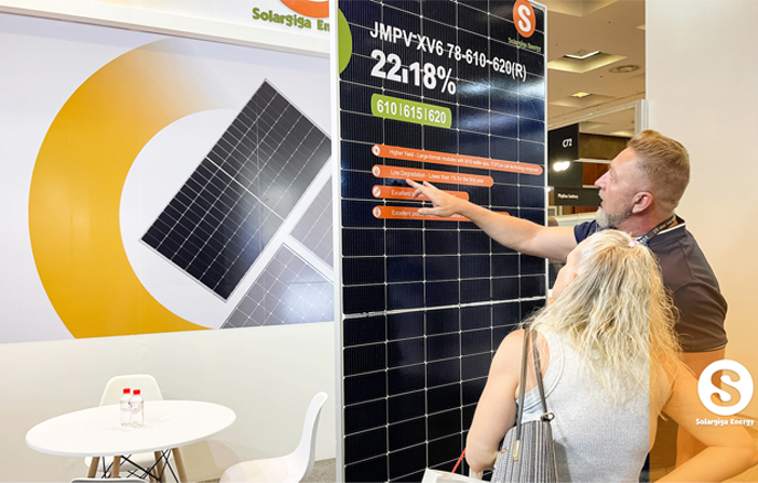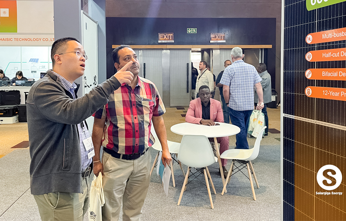 作為全球知名光伏組件制造商,陽光能源在本次大會上向來自全球的業(yè)界翹楚展示了我司的先進技術和創(chuàng)新產品。陽光能源3款Giga-P系列組件面向當?shù)卮笮偷孛骐娬镜葢脠鼍埃慨a功率最高可達670W;此外,陽光能源還展示了1款 Giga-N系列78片雙玻組件產品,以更高效、更前沿的組件特性,俘獲大批觀眾駐足欣賞。展會現(xiàn)場,陽光能源還與當?shù)鼗锇楣餐接懥四戏枪夥a業(yè)發(fā)展新機遇。