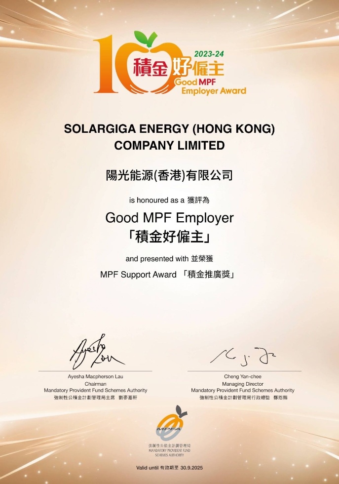 近日,陽光能源控股有限公司(以下簡稱“陽光能源”)旗下陽光能源(香港)有限公司憑借以人為本的理念和企業(yè)社會責任的踐行,被香港強制性公積金計劃管理局(MPFA)授予“積金好雇主”稱號和“積金推廣獎”榮譽,是陽光能源推進集團 ESG 工作的重要實踐,更是香港政府機構對我司建設優(yōu)秀雇主品牌、踐行 ESG 理念工作的充分認可。